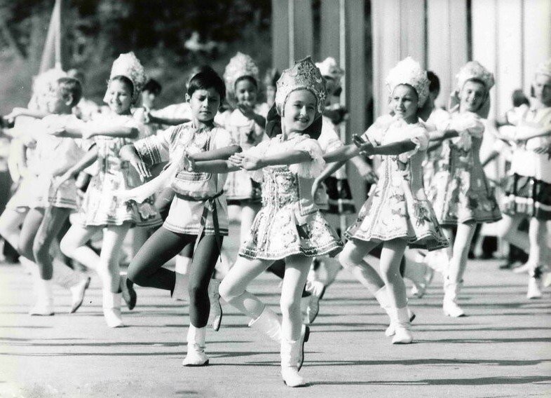 Дети в национальных костюмах народов 15 республик СССР и представители Вьетнамской республики.